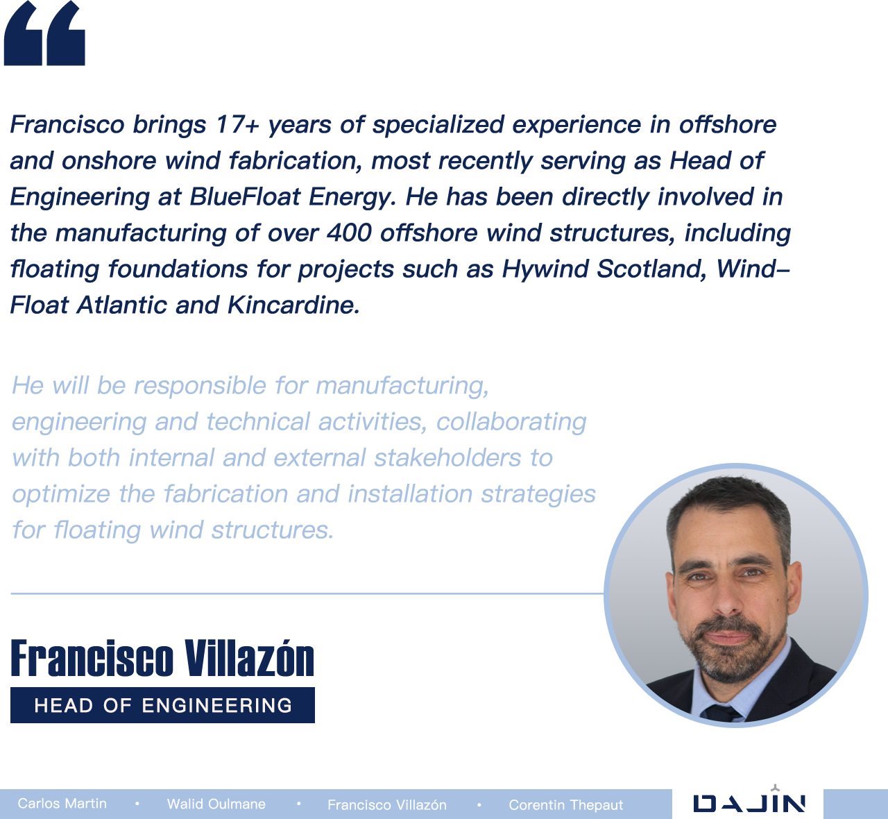 今后在Carlos Martin的领导下,浮式风电团队将助力大金实现提供集制造-运输-组装-交付于一体的一站式浮式基础解决方案,助力开发商和EPC承包商降低成本及规模化量产。
