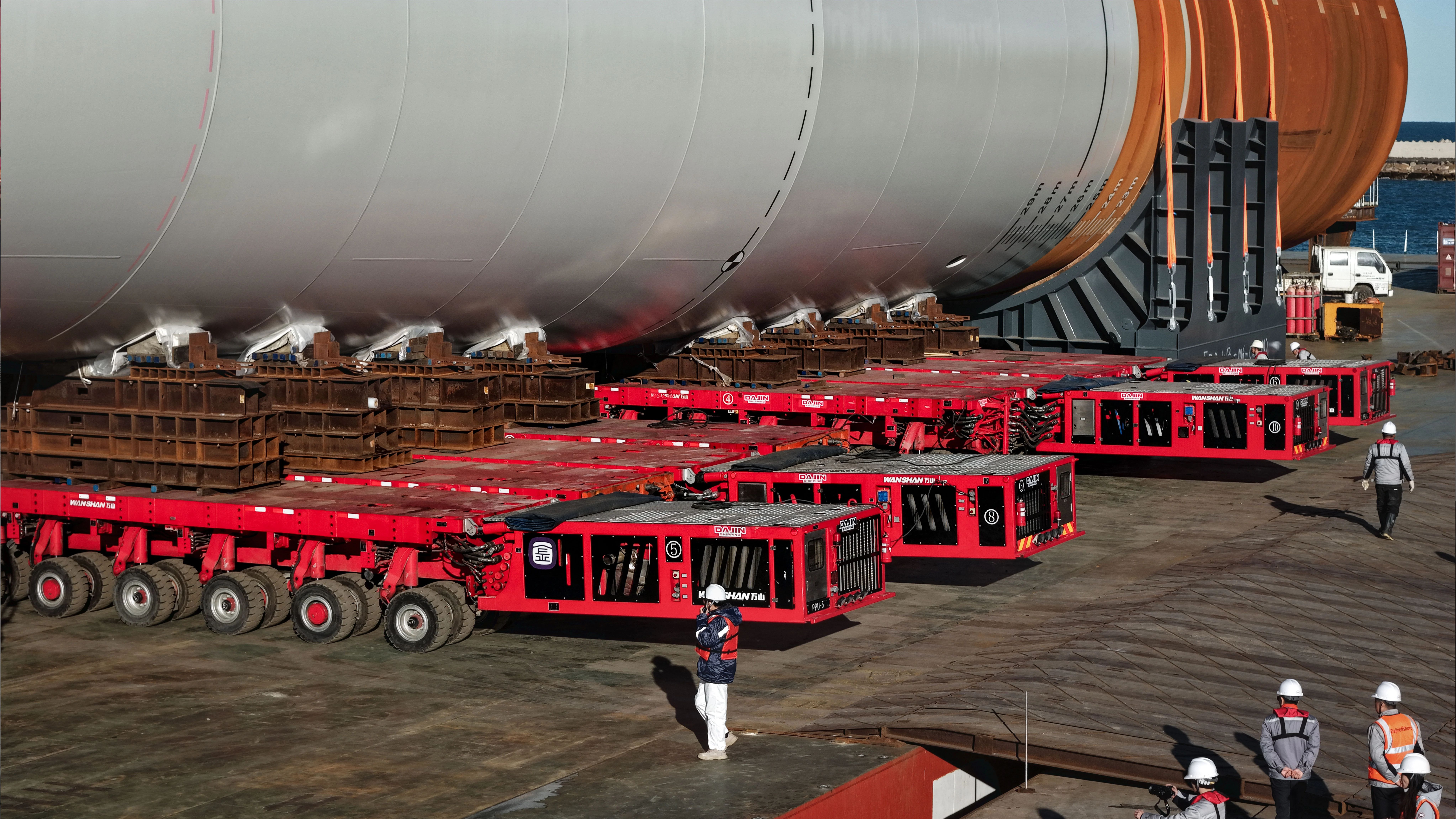 本次单桩滚装装船作业,是行业内首次采用国产自行式模块化运输车(SPMT)完成欧洲海上风电基础装船工作。大金SPMT团队与欧洲业主、船级社及船方在技术方案、车型配置、道路排障、驳船调载、工装配置、安全风险评估等各个环节进行多次讨论和验证,针对欧洲海上风电装船“高精度同步、高载荷适配、高海况适应”的严苛要求,定制了多模块协同控制优化方案与应急联动机制。作业中,团队凭借丰富的超大型构件运输经验与精准的现场调度能力,配合国产SPMT自主研发的核心技术,成功获得业务认可并成功完成装船作业,打破了该领域长期由欧洲进口设备垄断的格局,获得行业专家及欧洲业主的高度认可,即展现了大金团队精湛的方案设计能力、项目沟通协调能力以及操作执行能力,为国产高端运输装备进军国际海上风电市场开辟了新路径。